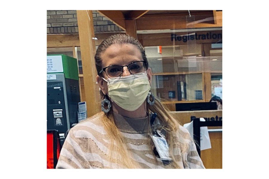 Peggy Setliff works in guest relations greeting and screening people at the hospital entrance.